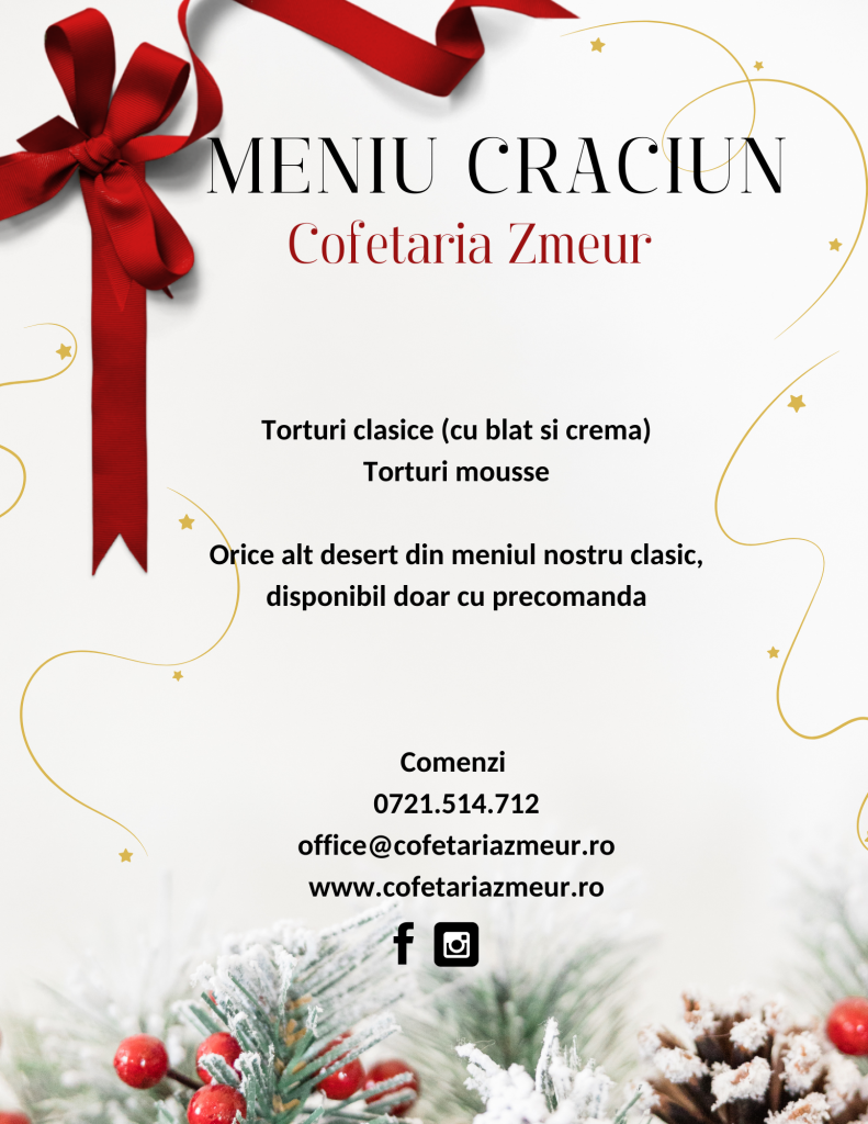 Descoperã magia sãrbãtorilor cu meniul de Crãciun de la Zmeur. Am pregãtit deserturi clasice, dar şi moderne, cozonaci pufoşi şi glazurati, mini prãjituri, cookies, dar şi torturi festive.